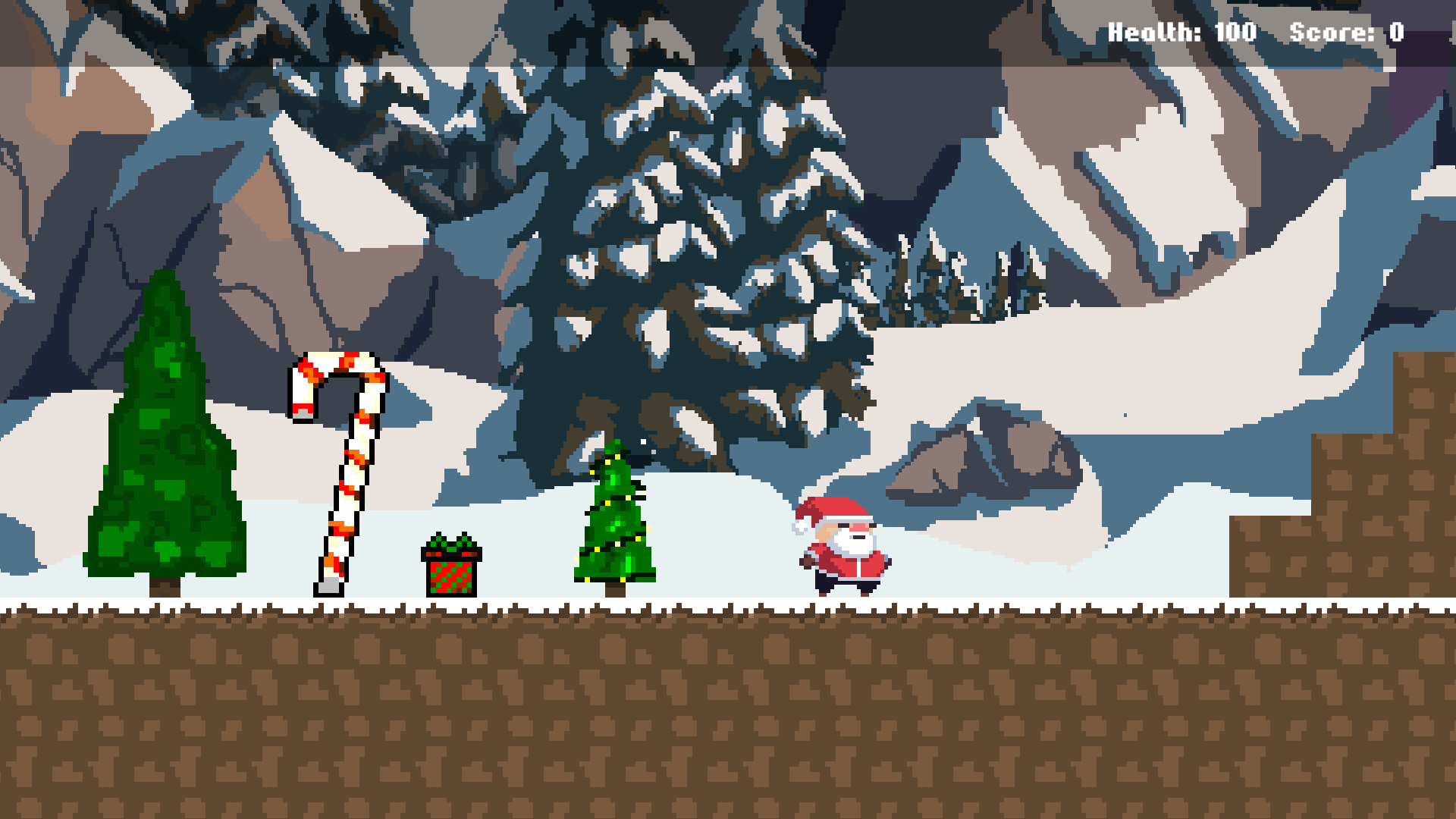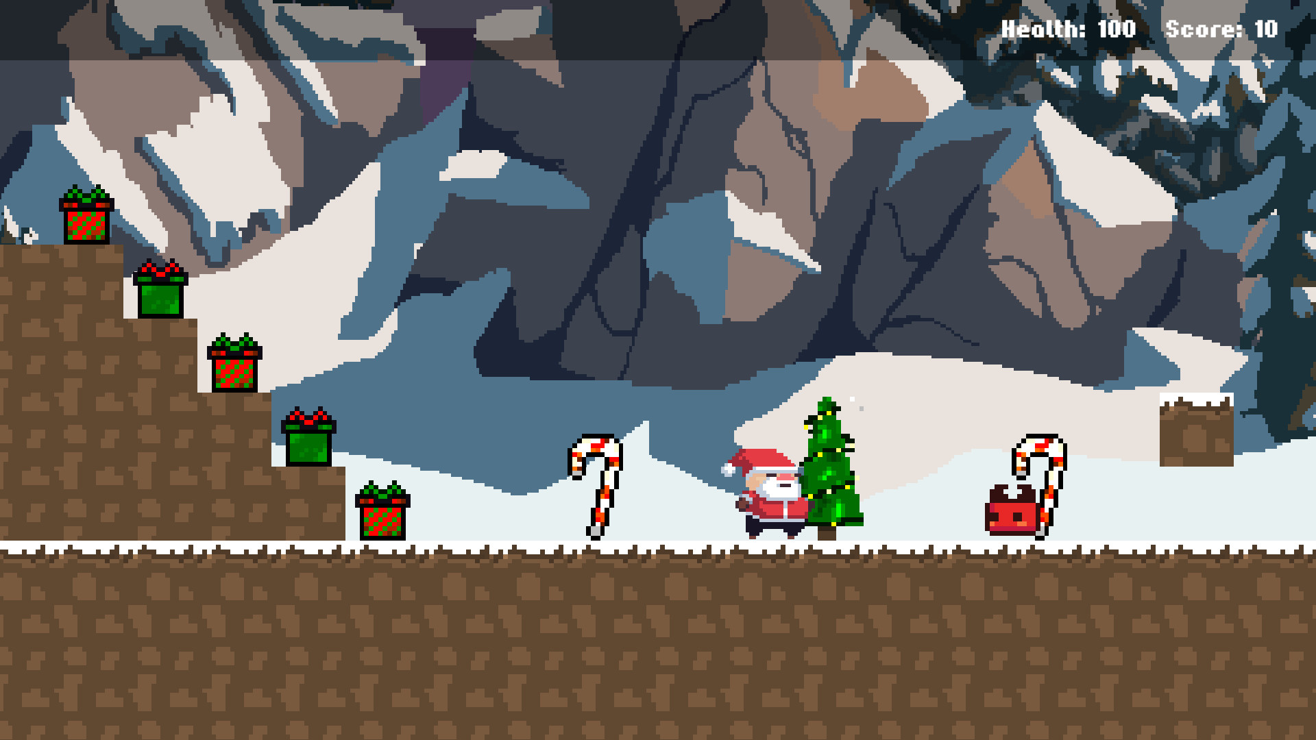 The main objective: You play as Santa and you need to collect as many presents as you can, while dodging enemies. Go slow take your time. It's a simple 2D Platformer game, so don't expect much. Take out the enemies one by one, because the colliders are buggy.